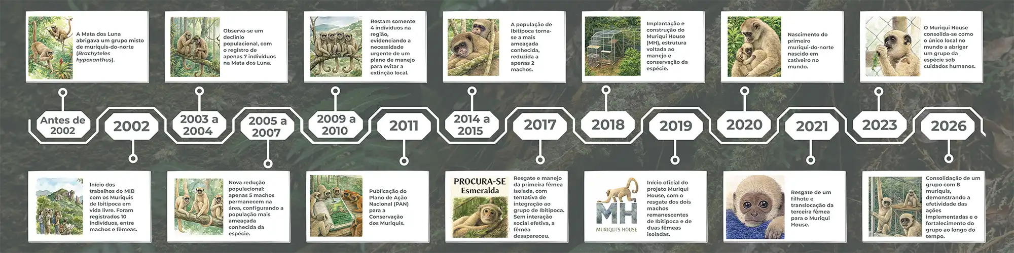 “Quando o MIB começou o trabalho no Ibiti Projeto, em 2002, foram avistados cerca de 10 muriquis na região. Ao longo de 12 anos, essa população entrou em declínio contínuo, até que, em 2014, restavam apenas dois machos, um cenário crítico, que apontava para a extinção local da espécie.